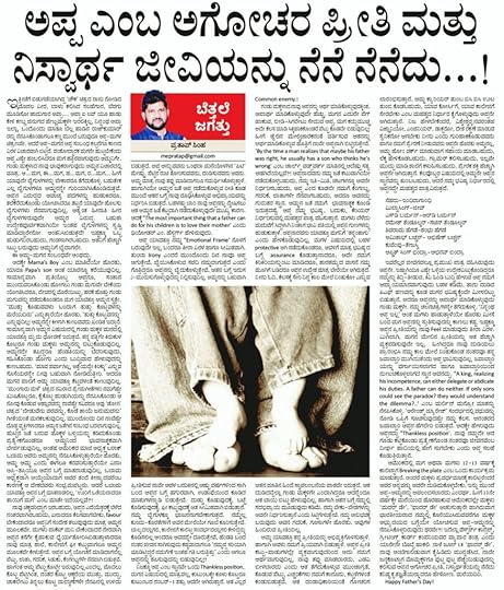 ಅಪ್ಪ ಯಾವತ್ತೂ ನಮ್ಮ “Emotional Frame” ನೊಳಗೆ ಬರುವುದೇ ಇಲ್ಲ. ಬಂದರೂ ತೀರಾ ವಿರಳ ಹಾಗೂ ಸೀಮಿತವಾಗಿ. ತುಂಬಾ Irony ಎಂದರೆ ಮುಂದೊಂದು ದಿನ ನಾವೂ ಅಪ್ಪ ಆಗುತ್ತೇವೆ, ಬೈಯಿಸಿಕೊಳುವ ಸರದಿ ನಮ್ಮದಾಗುತ್ತದೆ ಎಂದು ಗೊತ್ತಿದ್ದರೂ ಅಪ್ಪನನ್ನು ಬೈದುಕೊಳ್ಳುತ್ತೇವೆ, ಆತನ ಬಗ್ಗೆ ಇರುಸು-ಮುರುಸುಗೊಳ್ಳು ವುದನ್ನು ನಿಲ್ಲಿಸುವುದಿಲ್ಲ. ಅಮ್ಮನನ್ನು ಬಹುವಾಗಿ ಪ್ರೀತಿಸುವ ನಾವೇ ಅವಳ ಬದುಕಿನಲ್ಲಿ ಅಷ್ಟು ವರ್ಷಗಳಿಂದ ಸಾಗಿ ಬಂದ ಅಪ್ಪನ ಬಗ್ಗೆ ಹಗುರವಾಗಿ, ಉಡಾಫೆಯಿಂದ ಕೂಡಿದ ಮಾತುಗಳನ್ನಾಡಿ ಬಿಡುತ್ತೇವೆ. ದುಡ್ಡು ಕೊಡುವುದಕ್ಕೆ, ಬಟ್ಟೆ ಕೊಡಿಸುವುದಕ್ಕೆ, ಫೀ ಕಟ್ಟುವುದಕ್ಕೆ ಆತ ಸೀಮಿತವಾಗಿ ಬಿಡುತ್ತಾನೆ. ನಮ್ಮ ಬೈಗುಳಕ್ಕೂ ಭಾಜನನಾಗಬೇಕಾಗುತ್ತದೆ. ನಮ್ಮೆಲ್ಲ ಕುಂದು-ಕೊರತೆಗಳಿಗೆ ಅವನ ಮೇಲೆಯೇ ಗೂಬೆ ಕೂರಿಸುತ್ತೇವೆ. ಬಾಲ್ಯದಲ್ಲಾಗಲಿ, ಕಾಲೇಜಿಗೆ ಕಾಲಿಟ್ಟ ಸಂದರ್ಭದಲ್ಲಾಗಲಿ ಕೇಳಿದ್ದನ್ನು ಕೊಡಿಸಲಿಲ್ಲ ಅಂದರೂ ಅವನನ್ನೇ ದೂರುತ್ತೇವೆ, ಹೆಂಡತಿ ಬಂದ ನಂತರ ಜೀವನ ಸಾಗಿಸುವುದು ಕಷ್ಟವಾದಾಗಲೂ “ನಮ್ಮಪ್ಪ ಸರಿಯಾಗಿ ಮಾಡಿಟ್ಟಿದ್ದರೆ ನಮಗೇಕೆ ಇಂತಹ ಗತಿ ಬರುತ್ತಿತ್ತು” ಎಂದು ಆಗಲೂ ಅಪ್ಪನನ್ನು ಶಪಿಸುವುದನ್ನು ಬಿಡುವುದಿಲ್ಲ!!