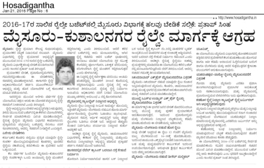 ಮೈಸೂರು.ಜ,20,2016: ಮೈಸೂರು ವಿಭಾಗದಲ್ಲಿ ರೈಲ್ವೆ ಪ್ರಯಾಣದ ಅಭಿವೃದ್ದಿಗಾಗಿ ಮುಂದಿನ 2016-17 ಸಾಲಿನ ರೈಲ್ವೆ ಬಜೆಟ್ ನಲ್ಲಿ ಕೆಲವು ಬೇಡಿಕೆ ಈಡೇರಿಸಬೇಕೆಂದು ಮೈಸೂರು-ಕೊಡಗು ಸಂಸದ ಪ್ರತಾಪ್ ಸಿಂಹ ಅವರು ಮಾನ್ಯ ರೈಲ್ವೆ ಸಚಿವರ ಬಳಿ ಮನವಿ ಮಾಡಿದ್ದಾರೆ.