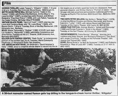 Promo for a screening of Alligator (1980) at the Red Victorian Movie House in San Francisco. That would have been fun, I am sure.