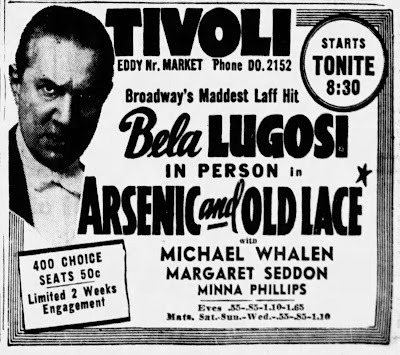 When I saw that Bela Lugosi was allowed to take a break from playing Dracula on the stage with this production of Arsenic and Old Lace, I rooted around to find a review of this production. Just to see if the play's famous running gag of Jonathan being made to resemble Boris Karloff (because the character of Jonathan had been played by Karloff, both on and off Broadway) had been changed or rendered even 'funnier' by the irony of having Bela Lugosi hamming up his rage at being said to resemble Karloff by any and all who saw him.