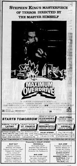 I was in Dallas, Texas, of all places, visiting a friend. That friend and I went to see Maximum Overdrive on its opening day and we had quite the memorable experience.