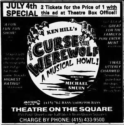 A little digging uncovered that The Curse of the Werewolf was a revival of 1976 'monster-melodrama' written by Ken Hill. The less than stellar review the Examiner critic gave this production, on June 15th, described Hill as an "English writer who takes public domain stories, redesigns them as spoofs, and sets them to public domain songs from long-forgotten operettas." Okay.