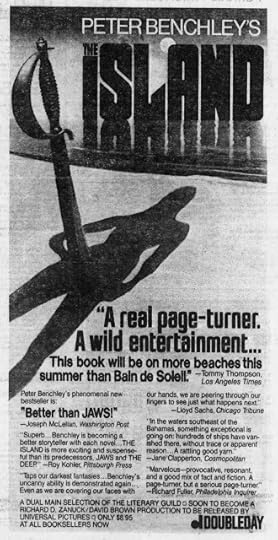 Which brings me to the less generous reason for why I kept bouncing off The Island. It read as pedestrian as a sidewalk, as dull as dishwater. It remains the Peter Benchley novel that I least enjoyed reading.