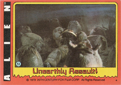 Captain Dallas warns Kane not to touch any of the ovoid formations. His warning, however, comes too late. Kane stares directly into one of the growths, then recoils as its opaque surface begins to clear...