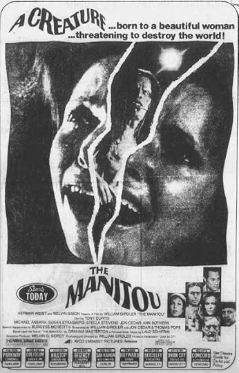 I would not see The Manitou until 1983 or 84, I think. Maybe. I am pretty sure it was while we were living in Hong Kong, I think. 1984 would also be the year that I tore through a bunch of Graham Masterton novels. Devouring The Pariah, The Manitou, The Djinn, and The Wells of Hell in quick and delighted fashion.