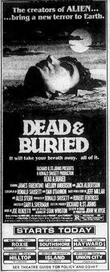 The memories I have regarding Dead & Buried are both vivid and murky. I remember being excited that an all-new horror movie from the writers of Alien was on the way. But the wait proved interminable, so I read the novelization, written by Chelsea Quinn Yarbro, before the film got around to unspooling at theaters and drive-ins near me.