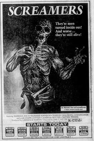 Roger Corman and New World Pictures took a considerable amount of heat for this infamous bit of advertising hyperbole, one that had audiences and critics hurling accusations of false advertising. Screamers was an Italian fantasy film, original title The Island of the Fishmen, that did not feature men getting turned inside out.