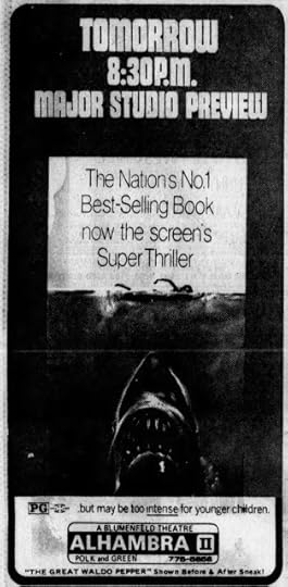 Here's an ad alerting San Francisco filmgoers of their chance to see a Major Studio Preview of the soon to be released 'Super Thriller' Jaws at 8:30 on Saturday night. While The Great Waldo Pepper, which was in general release at the time, was shown before and after Jaws, I don't known if the screening was considered part of a double-bill.
