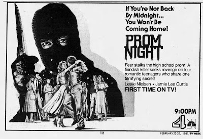 The Canadian slasher cash grab Prom Night debuted on network television a mere six months after its being shown at theaters and drive-ins around the San Francisco Bay Area. It might even have been on home video by then, I have no idea.