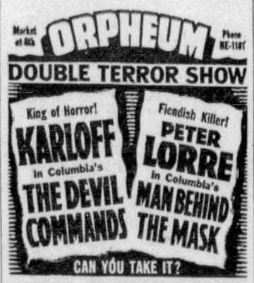 The Devil Commands, the "top half" of this so-called Double Terror Show, stars the legendary Boris Karloff as a scientist obsessed with communicating with his dead wife. I have never seen it. The same goes for The Face Behind the Mask, which the ad changes the title of to Man Behind the Mask for some reason. That has Peter Lorre playing a disfigured watch-maker whose rage at society drives him to a life of crime.