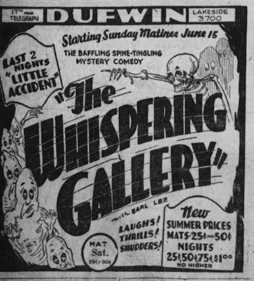 An article printed in the Saturday, June 14th edition of Oakland Tribune boasts that "thrill succeeds thrill with secret panels, ghostly apparitions, clutching hands and cloaked figures."