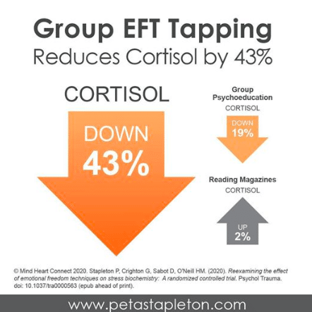 The only change she made to the original individually delivered trial was that she offered the EFT Tapping sessions in groups instead – and she achieved a 43% reduction in cortisol in 1 hour of EFT by doing this. Amazing!