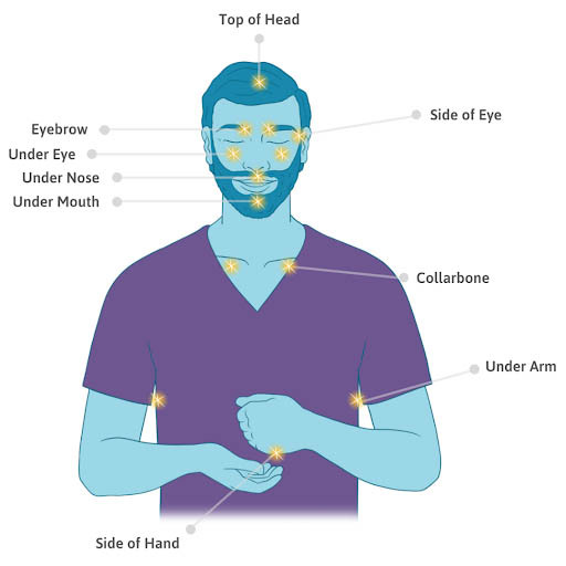Tips to help you get started with the Tapping techniqueUse a firm but gentle pressure, the same as if you were drumming on the top of your desk or testing a melon for ripeness.You can use all four fingers, or just one or two (usually the index and middle fingers). Four fingers are generally used on wider areas, while just one or two can be used on sensitive areas, such as around the eyes or under the nose. You can tap one side of the body or both at the same time. The meridian points are symmetrical on either side of the body.