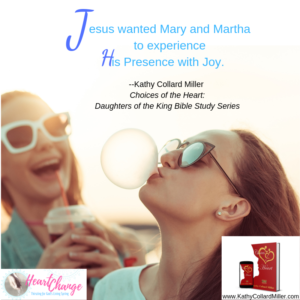How we hear God’s voice in our hearts can indicate a lot. Maybe we were scolded more than praised. Maybe we grew up thinking we didn’t deserve any praise, and we only expected to be reprimanded and not acknowledged for our efforts. Maybe currently we’re in a hurtful or damaging relationship.You might want to “try out” different tones as you speak Jesus’ words aloud. What emotion does a soft and encouraging tone create within you? Also, try to say Jesus’ words with different words to communicate several possible meanings. Jesus is saying, Oh, sweetie, please don’t worry about making a lot. We’ll be full after one of your delicious dishes. I’d rather you chose being at my feet like your sis has. Come and join us now. I love you even if we starve in your house.