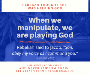 We sadly shake our heads in dismay, because Rebekah’s manipulations didn’t solve anything. God knew all this would happen when He determined the future and his prediction did indeed occur.