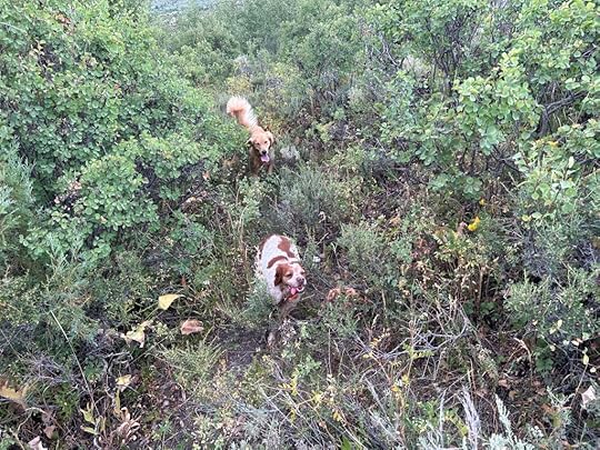 About seventy five yards up the valley, there is an area where bottom narrows between two hills which is choked with quakies and chest high berry brushes that just screams of grouse. The way it is tucked in between the hills makes me think of a subway station because of the plethora of grouse we usually find there. So, I call it the “Subway.” GSP Una circled a service berry bush in the Subway and a grouse cut right in front of me, presenting an easy shot which I missed twice because I did not get my cheek down on the gun. To pour salt into the wound, the bird lit in a tall Douglas Fir right beside me. Ugghhh!!! I groaned realizing I just missed an easy opportunity. Amateur Hour!