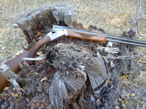 We drove another hundred yards up the canyon and observed yet another ruffed grouse in a grassy opening on the left side of the road. Shawn stopped the truck and I jumped out and walked briskly toward the grouse and it headed for some thick timber. I was getting ready for a tough shot when another bird flushed behind me and I spun and dropped it. As I went over to pick it up, I saw that it was still alive and was trying to get away.