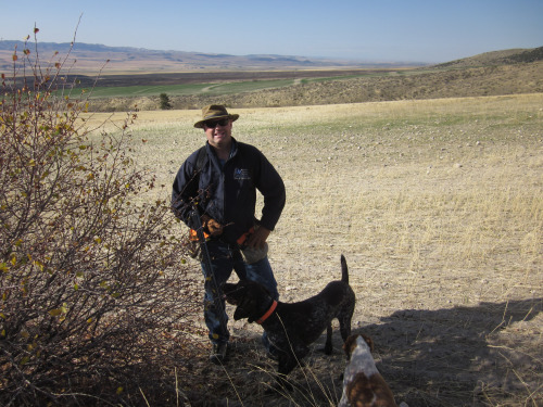 Following Tommy’s directions, we headed up onto another sage-covered bench. Shawn took the higher road and Tommy and I followed the more direct course to where he believed the birds went. Sunny, Misty and Brandy got birdy in this little grassy area and the gray rocket flushed hard to my right and—to my complete surprise—I promptly knocked it down. The Hun was only winged and bounced quickly down the nearby draw.