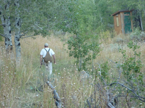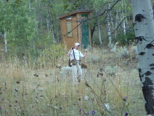 From Grouseketeer Ridge, we headed down to the new covert, which I was going to call, “The Hive,” but it now has a new name. We hiked further up the draw than I had the first time and observed, to our surprise, an outhouse in the middle of nowhere. What a weird place to put an outhouse! I took a few pictures of Jake approaching the outhouse and pointing to it and smiling. At that point, I realized that this covert is now officially, “The Outhouse Covert,” because (1) it inexplicably contains an outhouse; and (2) my shooting was Pure-T Crap the first time I went there. The name seems just perfect!