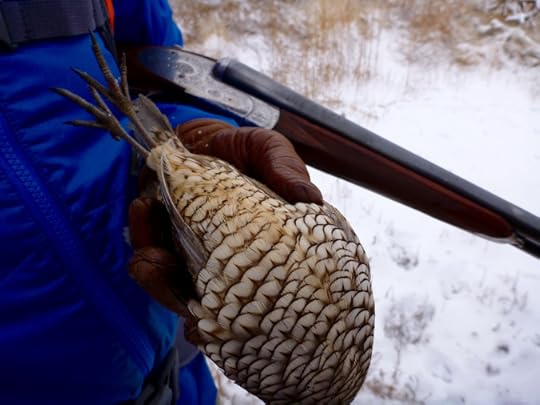 I slowly walk toward Misty, duck under the low lying branches, and catch a glimpse of the object of Misty’s point. I realize, however, that I am not in a good position to take a shot. So I bow under the branch and back track a few steps. The nervous bird has had enough and flushes noisily, quartering left to right. I miss with the first barrel, keep swinging, and slap the trigger again just as my view of the bird’s flight is covered up by a chokecherry bramble. To my utter amazement, the bird falls and tumbles into the snowy creek bottom.