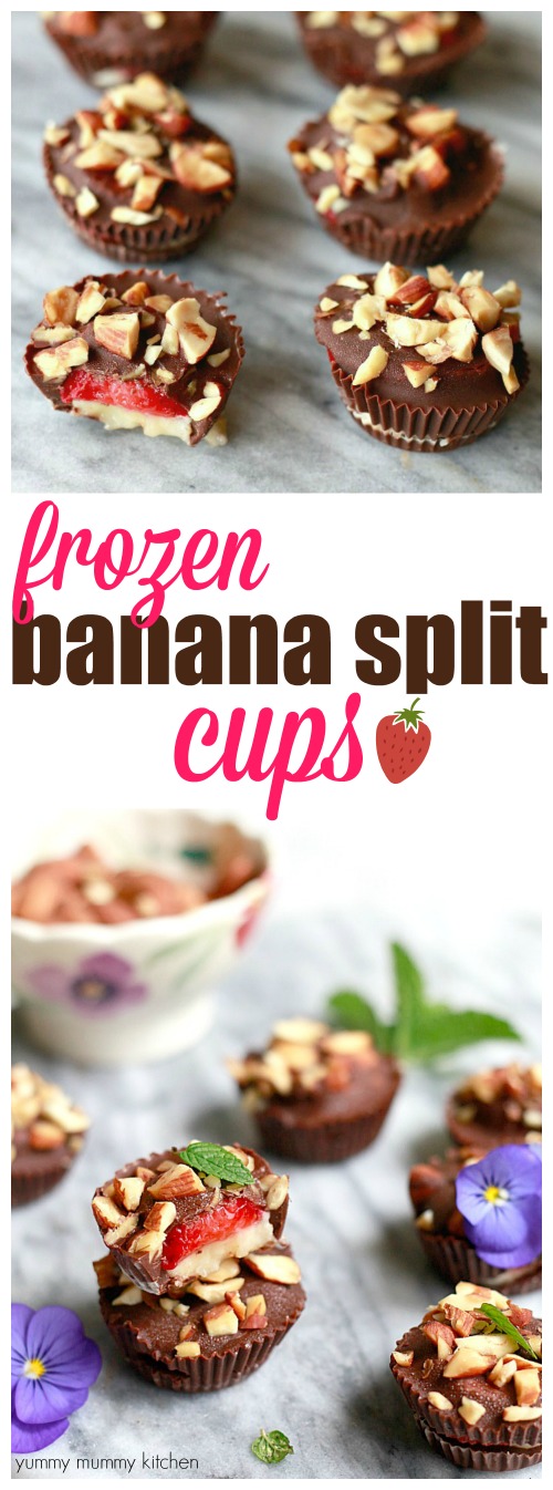 These chocolate covered frozen banana split bites make a delicious healthier treat. These are easy to make vegan and gluten-free. You're going to love these tasty little bites!Ingredients1 cup dairy-free chocolate chips such as Enjoy Life or Lily's Sweets1/8 cup coconut butter (or coconut oil) 1 banana, cut into 1/4" thick slices crosswise1 pint strawberries, cut into 1/4" thick slices crosswise1/3 cup chopped roasted almonds InstructionsLine a mini muffin tin with mini muffin wrappers. Coat the inside of wrappers with cooking spray.Melt the chocolate and coconut butter in a double boiler (glass bowl set over a pot of simmering water) stirring until smooth. Spoon a thin layer of melted chocolate into the bottoms of muffin cups. Top with one slice of banana and one slice of strawberry. Cover with another thin layer of melted chocolate. Use the spoon to move the chocolate around to the sides so that it encases the fruit. You may need to use small-medium sized strawberries so that they don't seal out the chocolate from dripping down the sides. Top with chopped nuts. Continue until you've used up your ingredients. Freeze for at least two hours. Chocolate banana split bites will be perfect to eat when allowed to thaw just a couple of minutes. Yield: Makes about 12