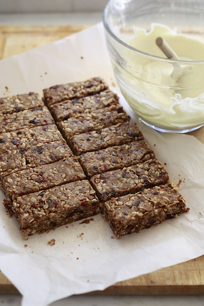 Peanut buttery, no-bake granola bars adapted from the the recipe at the Ranch at Laguna Beach. Ingredients2 1/2 cups dried fruit (cranberries, cherries, blueberries)1/2 cup macadamia nuts2 cups old fashioned oats2 cups rice krispie cereal1 3/4 cups smooth peanut butter 2 1/2 tablespoons molasses2 tablespoons honey 1 (12 oz.) bag white chocolate chips InstructionsLine 9x13" baking dish with parchment. Pulse dried fruit and macadamia nuts until thoroughly chopped. Place the fruit and nuts into a large bowl. Add the oats and cereal and stir to combine. In a saucepan over low heat, melt the peanut butter, molasses, and honey. It won't get "melty" but should all come together into a thick dough like ball. Transfer the peanut butter mixture to the bowl of dry ingredients and mix with your hands until fully incorporated. Press firmly into the pan with parchment. Cover with plastic wrap and let sit overnight. Melt chocolate in a double boiler or microwave. Cut the bars and dip into the melted white chocolate. Set on wax paper. Use a fork to drizzle more white chocolate over the top. Store bars in the refrigerator. Yield: Makes 1 9x13" pan of bars