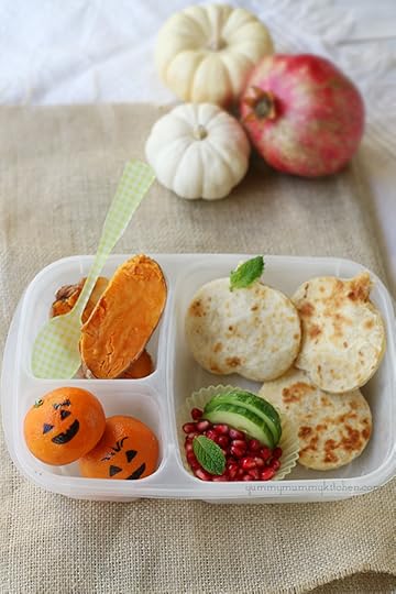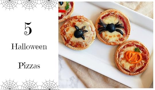 Cute Halloween pizzas made with English muffins and veggiesIngredients1 package of 6 English muffins8 oz. pizza sauce 8 oz. shredded mozzarella (or non-dairy cheese) 1 can large black olives (for bats and spiders)1 jar large green olives stuffed with garlic (for eyes)fresh basil (for monster eyes)3 mini orange bell peppers (for pumpkins)1/2 cup micro greens (for monster hair and pumpkin stems)yellow mustard (for bat eyes)1 red bell pepper (for monster mouth) InstructionsPreheat the oven to 400 degrees F and place the English muffins cut side up on a baking sheet. Spread a layer of sauce over the cut sides of muffins. Top with cheese. Bake 8 minutes, or until the cheese has melted. To make eyes, cut the green olives crosswise into rounds and remove the garlic. Cut the black olives into small pieces that fit inside the green olives for the pupils. See video. To make spiders, cut the black olives in half lengthwise for bodies. Then cut one legs by making thin slices lengthwise. See video. To make bats, cut black olives in half lengthwise. Then cut some of the halved olives into thin slices lengthwise. Cut the strips crosswise to make ears and wings. To make the bat eyes, dip a toothpick into mustard and draw on the olive halves. See video. To make pumpkins, cut the mini orange peppers crosswise into rounds and place on the pizzas. Cut strips to fill in the pumpkins. Use micro greens or a small piece of basil for the stem. See video.Yield: Makes 12 English Muffin Pizzas