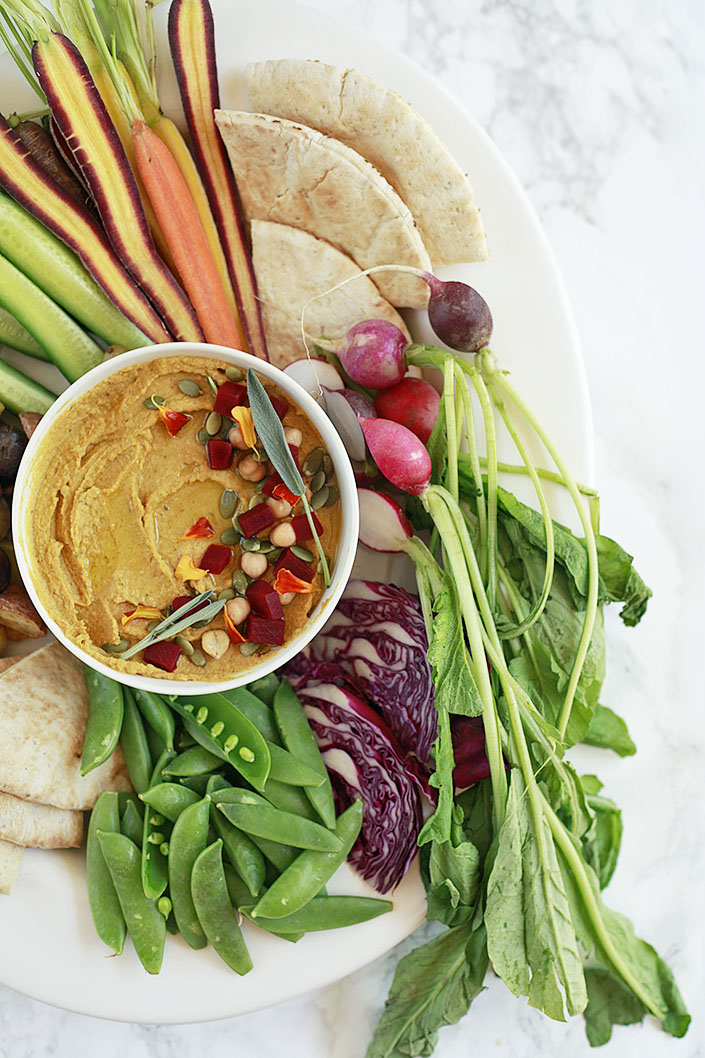 Pumpkin hummus is a beautiful dip for a crudités platter or just to keep in the fridge for snacking. It would be a fabulous appetizer for Halloween or Thanksgiving celebrations, and just as delicious as a vegan sandwich spread.