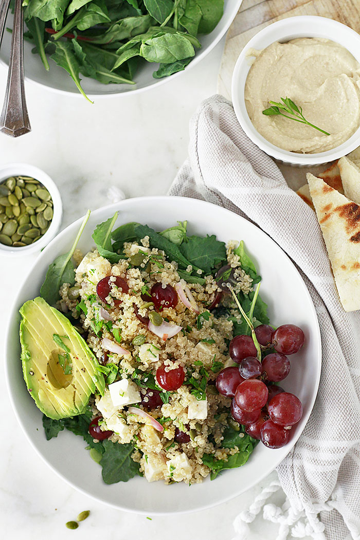 A hearty quinoa salad with baby kale, grapes, pepitas, and feta cheese. This is an excellent salad to make ahead and bring to work for lunch. Ingredients1 cup uncooked quinoa2 cups vegetable broth or waterjuice of 1/2 lemon2 tablespoons extra virgin olive oil1/2 tablespoon maple syrup3 tablespoons white balsamic (or red wine) vinegar1 cup halved red grapes1/3 cup fresh chopped basil1 shallot, peeled and thinly sliced1/3 cup cubed feta cheese1/3 cup pepitas or walnuts 2.5 oz. baby kale or spinach (about 1/2 bag) salt and pepper to taste InstructionsRinse quinoa. Bring veggie broth or water and quinoa to a simmer in a medium saucepan. Reduce heat to low and cover. Cook until all the water is absorbed and quinoa is translucent and soft. Transfer to a bowl and cool. Meanwhile, make the vinaigrette. In a small bowl or jar, whisk together the lemon juice, olive oil, syrup, and vinegar. Season to taste with salt and pepper. Combine the quinoa, grapes, basil, sliced shallot, cheese, nuts and greens. Dress with the vinaigrette. Season to taste with salt and pepper. I like my salads extra vinegary. If you do too, splash some more vinegar in to taste. Yield: Serves 4-6