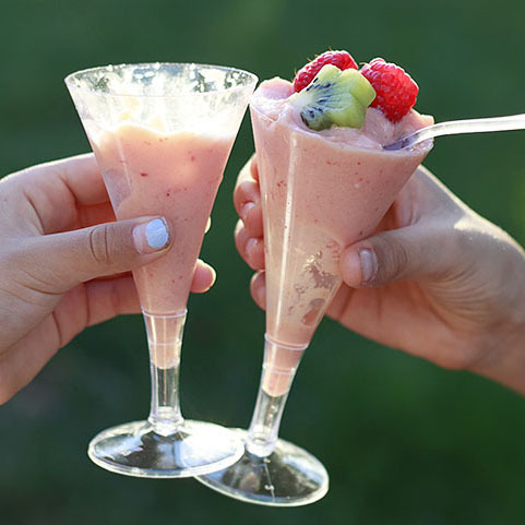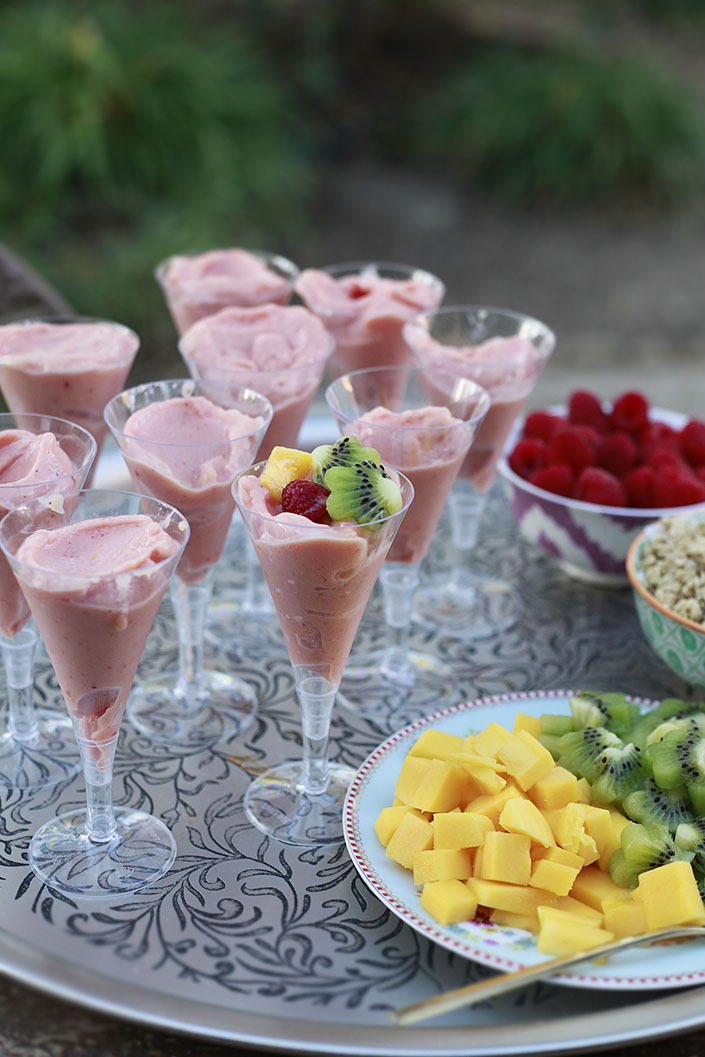 My favorite slumber party idea was a smoothie bar for breakfast. All of the girls loved this and I loved overhearing the girls saying, "your mom makes the best smoothies!" They all had seconds. I made a big blender of fruit smoothie and set out bowls of toppings: kiwi, raspberries, and granola. I would have loved to set out even more toppings like coconut, chia and hemp seeds, blueberries, etc. but this is what I had and the girls were hungry. They loved topping their own smoothies. Next time I would do this with small bowls so the girls would have more room for the toppings.