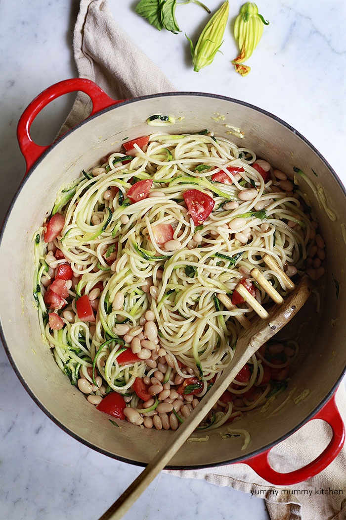 Easy zucchini noodle spaghetti with white beans and tomatoes. Even picky eaters love this version of zoodles! Ingredients4 oz. favorite dried spaghetti 2 medium zucchini, spiralized1/4 cup extra virgin olive oil6 cloves garlic, peeled and sliced pinch of red pepper flakes 1 (15 oz.) can cannellini beans, drained and rinsed 1 cup halved cherry tomatoes, or chopped Roma tomatoes 1/4 cup fresh basil or Italian parsley Parmesan cheese (optional) InstructionsBring a pot of salted water to a boil. Add spaghetti and cook until al dente, according to package directions. Drain and add to a large serving bowl with the zucchini noodles. The heat from the cooked pasta will begin to cook the zoodles. In the same pot over low heat, saute sliced garlic with the pepper flakes in olive oil. Cook 5 minutes or until garlic is tender and golden brown, taking care not to burn the garlic or it will become bitter. Add the beans, tomatoes, and both kinds of noodles back into the pot and toss to coat with garlic olive oil. Heat until zucchini noodles have softened and beans are heated. Stir in basil or parsley. Season with sea salt if needed. Serve with Parmesan, if desired. Yield: Serves 4
