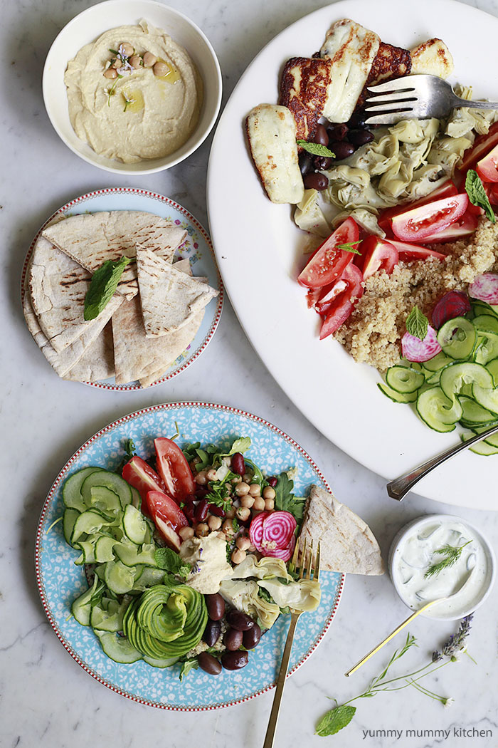 Hearty and flavorful Greek inspired Buddha bowls. Ingredients3 oz. favorite salad greens (I used arugula) extra virgin olive oil sea salt and freshly cracked pepper2 cups cooked quinoa 1 English hothouse cucumber, sliced or spiralized1 cup pitted kalamata olives, drained2 medium tomatoes, cut into wedges, or 1 cup cherry tomatoes (whatever kind looks good!) 1/2 red onion, thinly sliced 2 avocados, pitted, peeled and sliced1 cup marinated artichoke hearts, drained1 (15 oz.) can garbanzo beans/chickpeas, drained and rinsed2 tablespoons fresh chopped parsley1 small shallot, diced 1 clove garlic1 tablespoon lemon juice fresh mint leavesHalloumi cheesepita bread for servinghummus tzatziki or favorite dressing (optional) InstructionsFill bowls or plates with greens. Dress lightly with a drizzle of olive oil and a pinch of sea salt and pepper. Top with quinoa, cucumber, olives, tomatoes, onion, avocado, artichoke hearts, bean salad (below), and mint leaves. To make the bean salad, in a small-medium bowl, toss together the beans, 1 tablespoon olive oil, parsley, shallot, garlic, and lemon juice. If using halloumi, grill or pan fry in 1 tablespoon of olive oil until browned on both sides, about 3 minutes total. Serve halloumi warm on your salad bowl. Serve the Greek bowls with hummus and pita bread. Use the hummus on top of the salads or as a dip for the bread. Dress with a drizzle of your favorite dressing, if desired, salt and pepper, or a dollop of more hummus or tzatziki. Yield: Serves 4-6