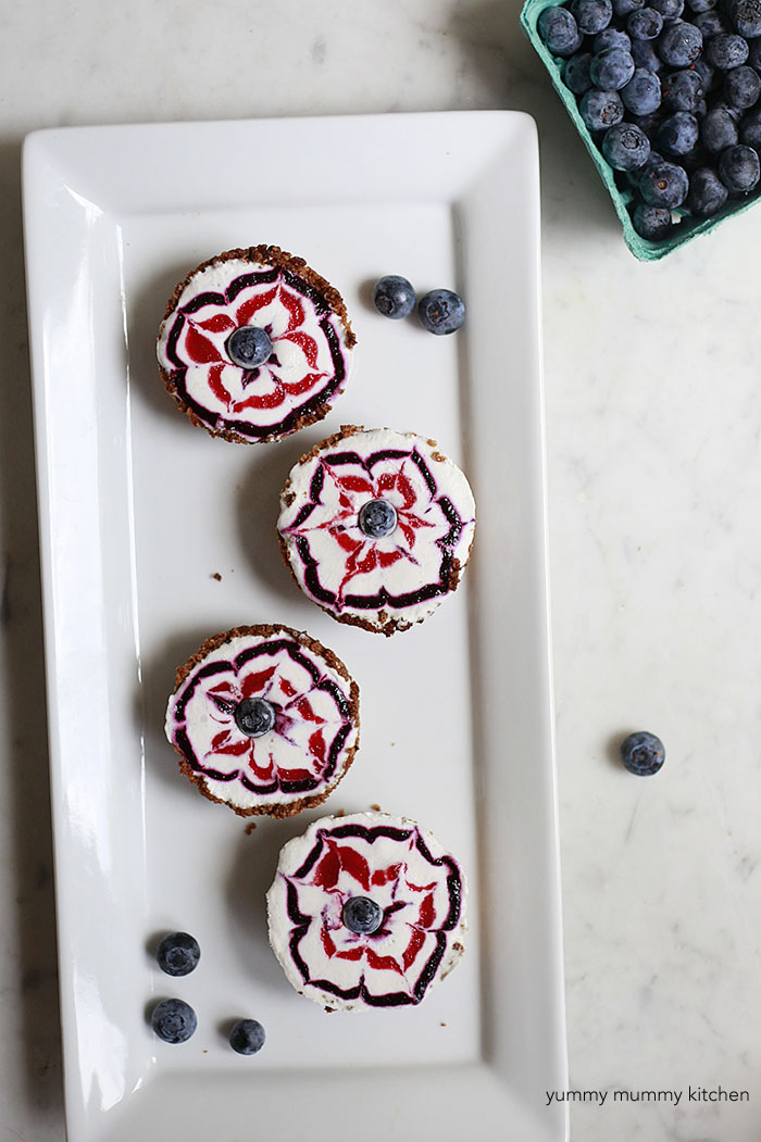 Adorable little mini ice cream pies all dressed up with red and blue berry sauces for 4th of July or Memorial Day. Ingredients2 cups natural homemade or store bought granola (gf and/or vegan if needed) 1/2 cup walnuts 4 tablespoons melted coconut oil or Earth Balance1 tablespoon maple or coconut syrup6 oz. strawberries, roughly chopped6 oz. blueberries2 tablespoons maple syrup2 tablespoons waterjuice of 1 lemon1 teaspoon organic cornstarch 1 pint favorite ice cream or frozen yogurt, softened (vanilla or coconut) InstructionsPreheat the oven to 350 degrees F. Coat a muffin tin with cooking spray. In a food processor, blend the granola, walnuts, coconut oil, and syrup until crumbly but holds together when pressed between fingers. You can add a little water, a teaspoon at a time if it's too dry. Divide the crust mixture evenly between 11 muffin tins, about 1 heaping tablespoon in each cup. Press the crust firmly into the bottom and up the sides of the cups. The crust won't come all the way up the cups. Bake for 7 minutes. Cool completely in the tin. Meanwhile, make the sauces. Place strawberries in one small saucepan and the blueberries in another small saucepan over medium heat. Add 1 tablespoon syrup, 1 tablespoon water, 1/2 lemon juice, and 1/2 teaspoon cornstarch to each pan and whisk to combine. Simmer until berries have completely broken down, about 15 minutes, whisking occasionally. Let sauces cool. Puree sauces individually in a blender, or press through a fine mesh sieve to ensure the sauces are very smooth. Transfer each sauce to a zip top sandwich bag and snip a tiny corner off for piping. With granola crusts still in the muffin tin, spoon softened ice cream into the cups. Smooth the top of ice cream. Pipe designs onto the top of the ice cream. You can make polka dots, swirls, criss-cross patterns, or drag a toothpick through circles to create "fireworks" as seen in the images. Have fun! Place the muffin tin in the freezer until ice cream is completely frozen. To remove pies, heat a sharp knife under hot water. Run the knife around the edge of each muffin tin to release. Yield: Makes 11 cupcake sized pies