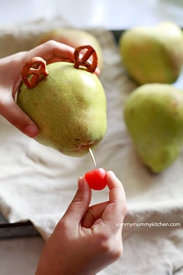 We attached candy eyes with melted chocolate. If you don't have candy eyes you could use peanuts or just a dot of chocolate. When you're ready to eat, just slice and enjoy! Pear Reindeer By Yummy Mummy Kitchen
