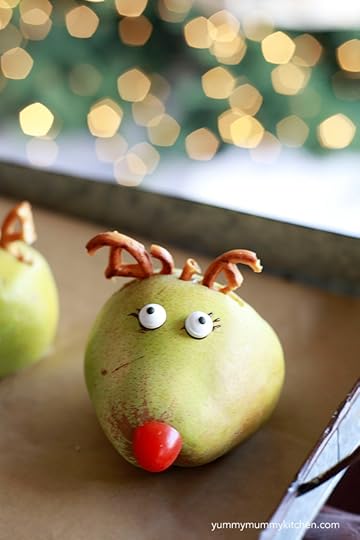 Pear reindeer make a cute and healthy holiday snack for kids. Ingredients1 pear2 pretzels 1 cherry tomato, halved1/4 cup melted chocolate chips 2 candy eyes (I used Wilton brand) InstructionsUsing a paring knife, slice a thin layer off one side of the pear so that it will sit flat without rolling. Place cut side down. Cut two small openings in the pear for the pretzel antlers. Insert antlers. Using a toothpick, attach the tomato nose. When chocolate has cooled enough to handle, place it into a piping bag or zip bag with a small corner cut off. Pipe two dots for eyes and attach candy eyes. Dip a toothpick in the melted chocolate to draw on eyelashes, if desired. Yield: 1