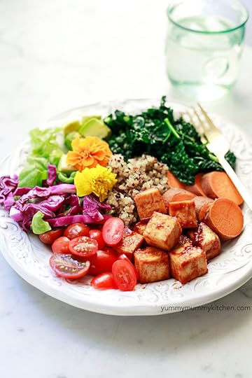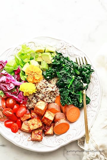 Detoxify with this satisfying and nourishing rainbow bowl filled with protein and vitamins. Ingredients1 lb. extra firm organic tofu, cubedfavorite BBQ sauce 2 cups cooked quinoa 2 sweet potatoes, sliced and roasted*2 avocados, cubed 1 1/2 cups cherry tomatoes, halved 1/4 purple cabbage, shredded or sliced 1 bunch Tuscan kale, roasted in olive oil or sautéed*favorite fresh greens or herbs such as cilantro Ranch or tahini dressing (optional) InstructionsPreheat oven to 375 degrees F. Pat tofu cubes with a paper towels to remove some liquid. Place on a cookie sheet coated with cooking spray. Spray lightly with cooking spray. Bake until golden brown, about 35 minutes, turning halfway through. Pour BBQ sauce over the tofu and toss to coat. You don't need to measure, just use enough to coat the tofu. Bake an additional 5 minutes. Pile tofu, quinoa, and veggies in bowls, creating a rainbow of foods. Dress with a little extra virgin olive oil and sea salt, or favorite creamy salad dressing like Ranch, if desired. Enjoy! *To roast sweet potato slices, roast on a cookie sheet at 450 degrees F for 20 minutes coated with cooking spray or evoo and a sprinkle of salt. I make this in advance and reheat throughout the week.