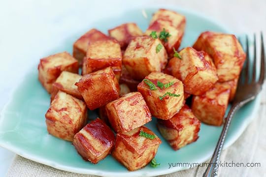 To make tofu that's flavorful, crispy on the outside and tender on the inside, and nutritious, I simply cube organic firm tofu. I pat it dry and bake it on a cookie sheet with cooking spray until golden brown. This time I added flavor with BBQ sauce - other times I use teriyaki or soy sauce.