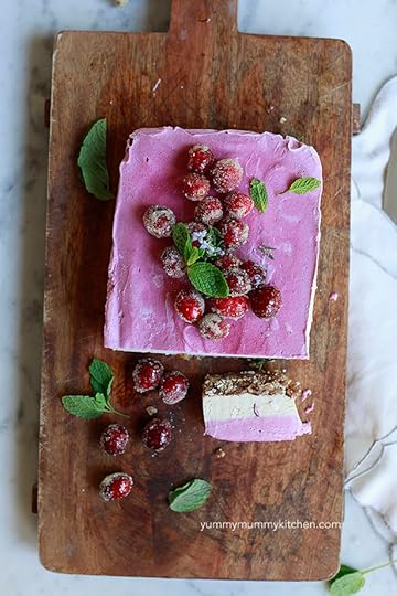 Delicious raw vegan cheesecake. Ingredients1 cup dates, pitted1 cup almonds, pecans, walnuts or a combination 1/2 cup unsweetened flaked coconut2 cups cashews, soaked overnight or 1 hour in a bowl with boiling water poured over1/4 cup coconut oil, melted1/3 cup coconut syrup or honeyjuice of 1 lemon3/4 cup almond milk or coconut milk 1 teaspoon vanilla extract, or seeds from 1 vanilla bean1 cup fresh cranberriessugared cranberries, for garnish (optional) InstructionsLine a loaf pan with plastic wrap or parchment paper. Set aside. Alternatively, spray a muffin tin with cooking spray for mini cakes. In the bowl of a food processor, pulse dates, nuts, and coconut until the mixture comes together when pressed, but not yet making a ball in the processor, as the little pieces of nuts give the crust crunch. If the mixture is too dry, add another date or a few drops of water. Press this crust into the bottom of the prepared loaf pan.Place the drained cashews, coconut oil, coconut syrup or honey, lemon juice and milk into the food processor and puree until very smooth and creamy. Stir in the vanilla bean seeds and discard the pod. Pour roughly 2/3 of the cashew "cream" over the crust. Slice a few of the cranberries and press them into the vanilla cream. Place pan into the freezer. Add the remaining cranberries to the food processor with the remaining 1/3 vanilla cream. Puree until smooth. Pour the cranberry cream over vanilla layer and place back in the freezer for several hours, until completely frozen. Our family likes this best served frozen and my kids consider this "Ice cream" but others prefer it just chilled like a cheesecake.Yield: 1-2 servings