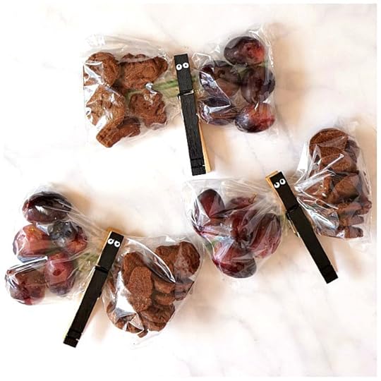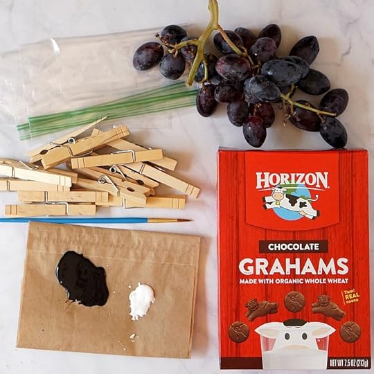 1 box zipper snack bags12 clothespinssmall bottle of black craft paintsmall bottle of white craft paint (or small wiggle eyes and glue)1 bunch dark purple or black grapes (quartered for young children)1 box Horizon chocolate grahamsINSTRUCTIONS