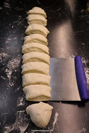Now roll your dough into a long sausage cylinder shape and and with a dough cutter or other, cut 7-8 equal pieces. Take each one and roll into a ball, then knead it into a round shape ready for cooking.