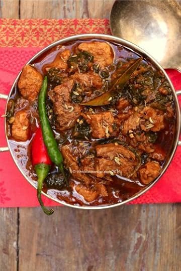 Now add the ‘chicken’ pieces and cover. Simmer for 20 minutes until they absorb the spice mix. Now add the water and cover – simmer gently for 10 more minutes, and add the spinach leaves or if using frozen the thawed spinach and chopped coriander. Uncover and allow to simmer for a further 10 minutes or until it has thickened nicely.