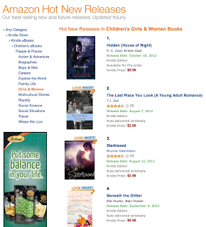 Then even more fun, I was just kind of looking around the Kindle store this morning and looked to the right of my screen and saw Starkissed listed under Girls and Women Hot New Releases. And when I clicked on the link it took me to the Hot New Release list and Starkissed was ranked at #3! It's dropped to #4 right now, but I can't explain how excited I was when I saw it there. It also made the Hot New Releases People and Places list, coming in at #12 last I checked!