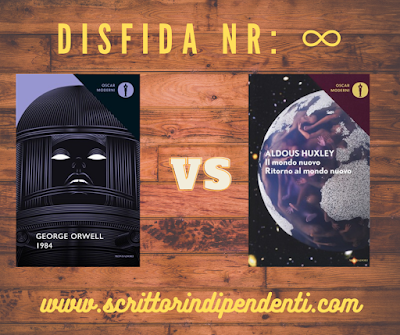 Per oggi ho pensato una Disfida del tutto particolare, giusto per alimentare un po' il confronto fra gli appassionati di questi due autori. Non ci sono autori indipendenti coinvolti, ma a sfidarsi saranno infatti i due romanzi distopici che vengono citati più spesso di questi tempi. Uno è 1984 di George Orwell che per l'occasione se la vedrà con Il Mondo Nuovo di Aldous Huxley.