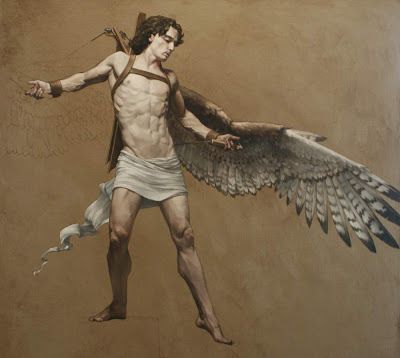 I've been thinking about Icarus lately, ever since I stumbled across this amazing painting by Bryan Larsen. It's not complete (you can see the outline of Icarus' right wing and the beginnings of a set of steps at the bottom), but I kind of like it this way. It's as if he's stepping out of the vague scratchings of myth into the fleshiness of reality.