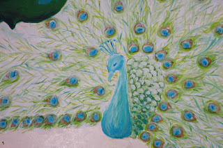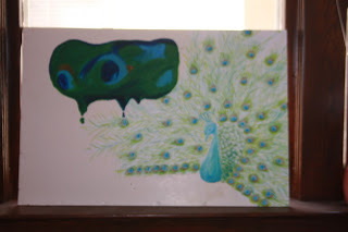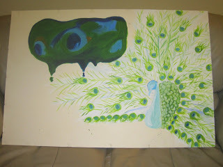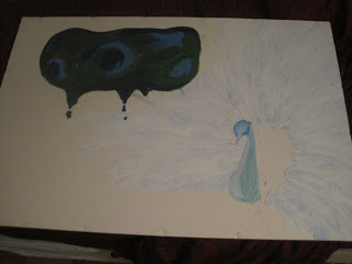 A peacock painting I created from a dream I had. In my dream, the peacock was pale blue and all its colors were floating in a liquid blob above its head...