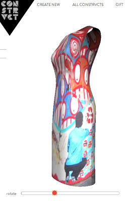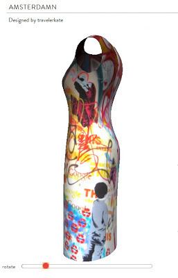 I ran across the Constrvct website via Ecouterre (a weekly newsletter I get about sustainable clothing and fashion). Essentially, you can design your own dress or t-shirt using photos you have taken or artwork you've made. Anything that's in a jpeg form. The dresses are pretty pricey to purchase (about $350!), but it's fun to mess around with the website and create one-of-a-kind designs. I entered this one into a competition: