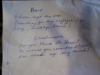 "Bravo"Elmer left his bedSearching for his rightful life.Sang, "Goodbye Irene!""Questionable"Do you think it's Here?Or would you consider There?I've made up my mind!