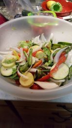 Another thing I liked about this recipe is it’s flexible. I used the vegetables that the recipe called for and then did my refrigerator clean up. What’s this? I scanned my crisper drawers and dumped the veggies that were in danger of reaching the end of their shelf life–and dumped them in the bowl.