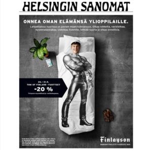 The following year, in 2015, the largest newspaper in Finland, Helsingin Sanomat, had an advert on its cover, with a message to the new Baccalaureate graduates. A boy in a graduate cap is tucked in between Tom of Finland bed sheets with the caption,
