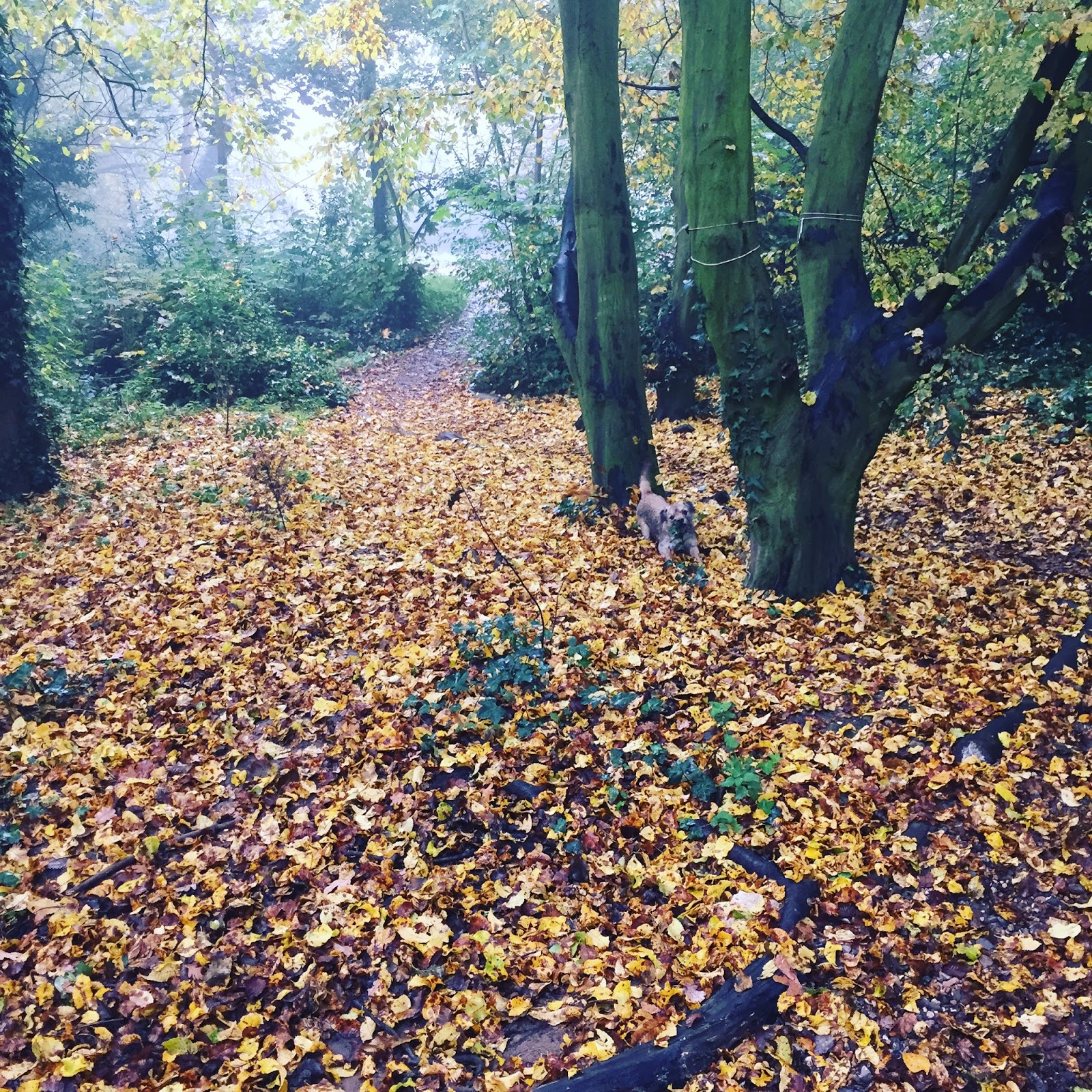 The terrier camouflaged by the autumn leaves.October 31, 2015
